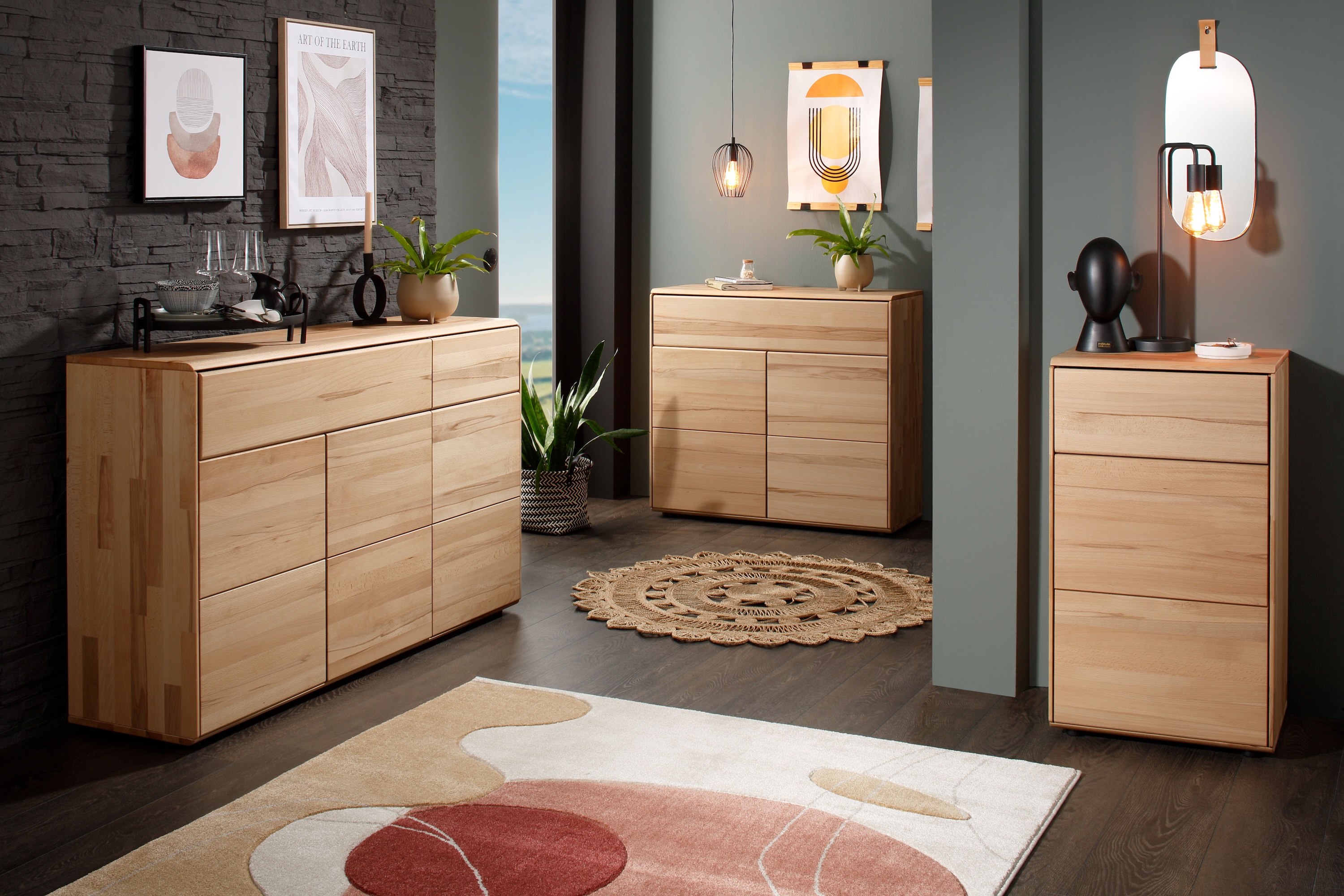 Die Kollektion vereint natürliche Schönheit und innovative Funktionalität. Hergestellt aus hochwertiger Wildeiche oder Kernbuche überzeugen diese Möbel durch ihre weichen, sanft gerundeten Kanten. Die grifflosen Schubkästen mit Tip-on-Funktion ermöglichen ein müheloses Öffnen durch leichtes Antippen. Verleihen Sie Ihrem Wohnraum einen Hauch von zeitloser Eleganz und modernem Komfort – mit dieser exklusiven Möbelserie.